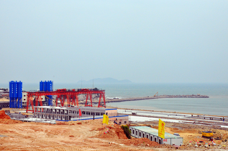 東防波堤工程全長5423米,西防波堤工程全長3315米,口門寬度600米?陂T堤頭段采用直立式沉箱結(jié)構(gòu),其他堤身段采用拋石斜坡堤結(jié)構(gòu),共需拋填各類石料1060萬m3,澆筑混凝土82.6萬 m3,項目總投資為25.45億元,建安費(fèi)17.94億元。東西防波堤建成后,形成港池面積6平方公里,岸線10850米,可建3-30萬噸級泊位30-35個,設(shè)計吞吐量2億噸。