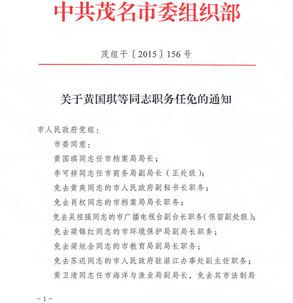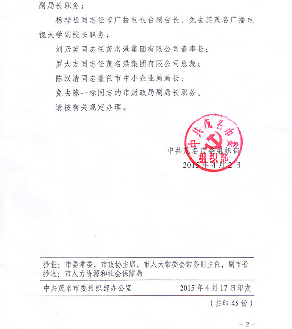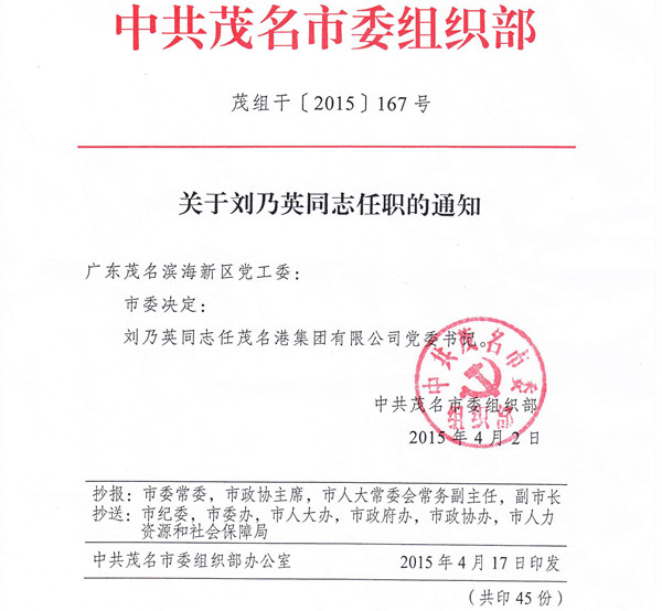市委決定:劉乃英同志任茂名港集團(tuán)黨委書記、董事長(zhǎng) 羅大方通知任集團(tuán)公司總裁.pdf