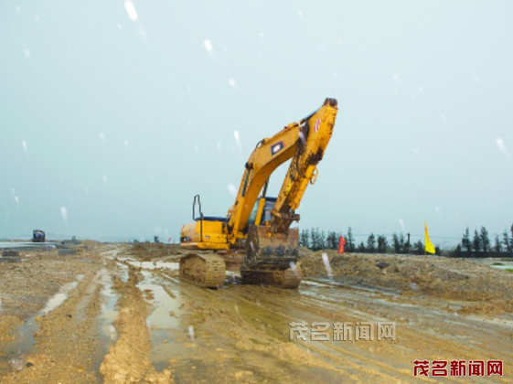 (圖為博賀灣生態(tài)新城為趕進(jìn)度冒雨施工)