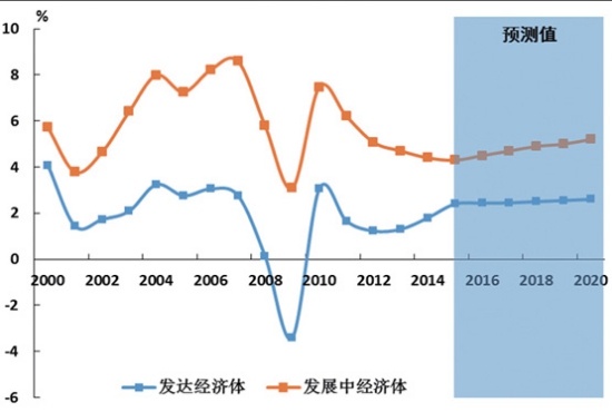 圖1 世界經(jīng)濟增速 發(fā)展中經(jīng)濟體地位繼續(xù)提升,經(jīng)濟增長的引擎回歸發(fā)達經(jīng)濟體。2000-2007年發(fā)展中經(jīng)濟體年均增速為6.7%,高于世界平均增速2.3個百分點。受到金融危機沖擊,發(fā)達經(jīng)濟體出現(xiàn)大幅度的下滑(如圖2所示),歐美日經(jīng)濟同時面臨巨大沖擊甚至出現(xiàn)萎縮,發(fā)展中經(jīng)濟體雖然經(jīng)濟增速有所下降,但明顯好于發(fā)達經(jīng)濟體,發(fā)展中經(jīng)濟體特別是中國一度扮演了世界經(jīng)濟增長引擎的角色。依托技術優(yōu)勢,發(fā)達經(jīng)濟體增速呈現(xiàn)回升態(tài)勢,而發(fā)展中經(jīng)濟體增速將有所放緩,與世界經(jīng)濟平均增速差異明顯縮小到1.1個百分點。預計“十三五”期發(fā)達經(jīng)濟體的年均增速為2.5%,發(fā)展中經(jīng)濟體為4.9%(如圖2所示)。按照對世界經(jīng)濟增長的絕對凈貢獻來計算,經(jīng)濟增長引擎開始回歸到發(fā)達經(jīng)濟體,這意味著相對于集裝箱而言,大宗貨物海運需求減緩將更加明顯。