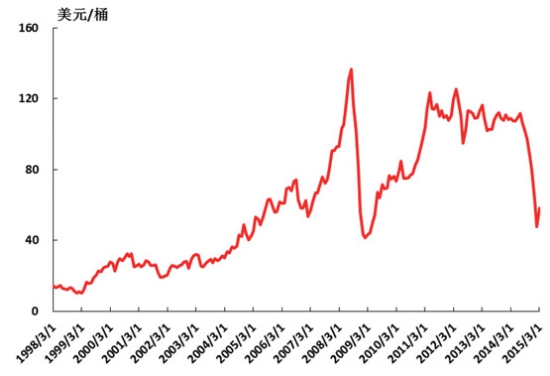 圖2 發(fā)達經(jīng)濟體與發(fā)展中經(jīng)濟體增速 2. 資源類大宗商品供需關系轉換,商品價格相對低位。 大宗資源類價格進入一輪低谷。在上一輪世界經(jīng)濟快速增長的帶動下,對石油、鐵礦石等資源類商品需求快速增長,天平向供給方傾斜,推動了資源價格大幅度上漲(如圖3和圖4所示),同時也刺激資本對資源開發(fā)、生產(chǎn)投入大幅度增長。在世界經(jīng)濟增速放緩、生產(chǎn)率效率持續(xù)提高和日益注重節(jié)能減排的背景下,需求減弱,而產(chǎn)出穩(wěn)定增長,供需關系出現(xiàn)了失衡,天平向需求方傾斜,資源價格開始大幅下跌。石油價格一度跌至40多美元,中國鐵礦石到岸價也跌至60-70美元的水平(如圖3和圖4所示)。從多個機構的預測來看,今后一個時期大宗商品價格很難有大幅提升。