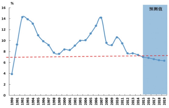 圖3 布倫特原油現(xiàn)貨價格 3. 技術孕育新突破,世界經(jīng)貿(mào)構筑新格局。 自身發(fā)展規(guī)律和全球經(jīng)濟調(diào)整都揭示出未來將取得重大技術突破。從重大技術突破自身規(guī)律看,當前正處于孕育期,盡管突破的核心技術難以預測,但可以看到信息化、能源和人工智能以及以美國為代表的生物醫(yī)藥技術,都可以作為孕育突破的溫床。身邊就可以看到的是互聯(lián)網(wǎng)正逐步改變著企業(yè)經(jīng)營和人們的生活消費,突破了以往的商業(yè)模式。 技術經(jīng)濟對比變化和各國戰(zhàn)略調(diào)整,推動形成新的經(jīng)貿(mào)格局。為有效應對經(jīng)濟發(fā)展和全球氣候變化面臨的新問題,發(fā)達國家依托技術優(yōu)勢,促使經(jīng)濟逐步復蘇,并成為世界經(jīng)濟增長的主要動力。美國重振制造業(yè)和德國工業(yè)4.0代表著西方國家的制造業(yè)開始重新展現(xiàn)出新的活力,成為經(jīng)濟復蘇的重要動力,同時以歐盟為代表的發(fā)達國家依托節(jié)能減排技術優(yōu)勢,大力推動低碳發(fā)展和碳交易,也在重塑世界制造業(yè)貿(mào)易格局,帶動發(fā)達國家重回世界引擎地位。發(fā)展中實體之間經(jīng)濟增長也開始出現(xiàn)差異,金磚國家之間分化明顯,預計“十三五”期印度經(jīng)濟年均增速約為6.5%,而巴西、俄羅斯分別降為2.7%和1.8%。世界經(jīng)濟力量、技術力量對比的變化,加之地緣政治和各國戰(zhàn)略的調(diào)整,正在推動全球形成新的經(jīng)貿(mào)格局,為適應這種變化,美國通過主導的TPP、TTIP意在構筑國際貿(mào)易的新規(guī)則 TPP,與此相對應,我國也通過全面推進自由貿(mào)易區(qū)和“一帶一路”戰(zhàn)略,來適應國際形勢變化,調(diào)整國家戰(zhàn)略。 “十三五”我國經(jīng)貿(mào)發(fā)展特點 1.我國經(jīng)濟轉向中速增長階段,經(jīng)濟結構發(fā)生轉折性變化。 經(jīng)濟進入中速增長階段。圖5顯示了1990年以來我國經(jīng)濟增速的變化。2000-2010年我國經(jīng)濟、對外貿(mào)易分別保持了年均10.5%和20.2%的增長,2010年后呈現(xiàn)逐步放緩態(tài)勢,2014年降為7.4%。當前,我國經(jīng)貿(mào)發(fā)展面臨十分復雜的國際環(huán)境,內(nèi)部則處于“三期”疊加期。隨著新型工業(yè)化、信息化、農(nóng)業(yè)現(xiàn)代化和城鎮(zhèn)化“新四化”的不斷推進,以及市場機遇、投資機遇、綠色機遇和對外合作機遇的不斷擴大,為我國經(jīng)濟增長提供了巨大潛力和回旋空間。這些發(fā)展環(huán)境變化使我國經(jīng)濟發(fā)展進入新常態(tài),預計2015年GDP增長約7%,“十三五”期間經(jīng)濟平均增速只要保持在6.6%(如圖5所示),即可實現(xiàn) 2020年GDP總量比2010年翻一番的戰(zhàn)略目標,按照人均GDP水平測算,我國將進入高收入國家行列,對海運需求質量將全面提高。
