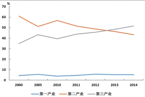 圖5 我國GDP增速變化 產(chǎn)業(yè)與區(qū)域經(jīng)濟結構調(diào)整,第三產(chǎn)業(yè)成為經(jīng)濟增長的主要動力。隨著經(jīng)濟社會的進步,經(jīng)濟結構不斷優(yōu)化,第三產(chǎn)業(yè)所占比重逐步提高,并于2013年首次超過第二產(chǎn)業(yè)(如圖6所示)。未來,經(jīng)濟將進入中速增長階段,而第三產(chǎn)業(yè)可望保持相對較快的增長,占GDP比重持續(xù)提高,結構不斷優(yōu)化。從三駕馬車的貢獻來看,外貿(mào)和投資的作用逐漸減弱,經(jīng)濟增長主要依托消費的增長。消費的增長并不能像第二產(chǎn)業(yè)那樣直接拉動運輸需求量的增長,這一態(tài)勢使得運輸需求對GDP增速彈性減弱。 經(jīng)濟增速整體放緩與個別產(chǎn)業(yè)快速增長并存。從產(chǎn)業(yè)發(fā)展角度來看,無論是從國家深化改革,還是實體經(jīng)濟發(fā)展,要素資本的作用正逐步減小,制度資本的作用開始顯現(xiàn),創(chuàng)新發(fā)展開始優(yōu)于要素的投入,表現(xiàn)為在我國經(jīng)濟增速整體放緩的背景下,各產(chǎn)業(yè)之間開始呈現(xiàn)明顯分化,如電商業(yè)務、快遞業(yè)務等開始出現(xiàn)爆發(fā)式的增長。從企業(yè)效益看,近年來,盡管我國企業(yè)整體的回報在下降,但是少數(shù)產(chǎn)業(yè)回報依然保持較高水平。