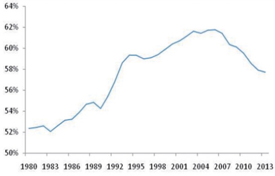 圖6 三大產(chǎn)業(yè)占規(guī)模經(jīng)濟比重變化 區(qū)域協(xié)調(diào)發(fā)展,沿海地區(qū)占經(jīng)濟比重下降。隨著西部開發(fā)、中部崛起戰(zhàn)略的實施,中西部地區(qū)逐步扭轉了經(jīng)濟增速長期低于沿海地區(qū)的態(tài)勢,2004年后在經(jīng)濟總量中所占比重逐步上升。根據(jù)國家全面建成小康社會目標,在長江經(jīng)濟帶、“一帶一路”和京津冀協(xié)同發(fā)展國家戰(zhàn)略的推動下,東部沿海經(jīng)濟最發(fā)達地區(qū)將保持穩(wěn)定增長,但所占GDP比重呈現(xiàn)下降態(tài)勢(如圖7所示),各區(qū)域間的經(jīng)濟發(fā)展水平在趨于均衡。