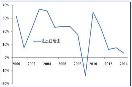 圖7 沿海地區(qū)(含北京)占全國GDP比重 2.對外貿(mào)易彈性下降,貿(mào)易伙伴多元化。 外貿(mào)保持穩(wěn)定增長,與經(jīng)濟彈性進一步下降。在加入WTO的帶動下,2000-2007年我國外貿(mào)進出口總額保持了24.3%的年均增長(如圖8所示),與 GDP的彈性系數(shù)高達2.25,明顯高出世界1.5的平均水平,成為世界重要經(jīng)貿(mào)大國。受到金融危機沖擊和全球貿(mào)易放緩的影響,面對國內(nèi)外復雜形勢,2007-2014年我國對外貿(mào)易仍保持較快發(fā)展,外貿(mào)進出口總額年均增速達到10.2%,國際貿(mào)易地位不斷提高,成為世界第一貨物貿(mào)易大國。隨著貿(mào)易依賴度的提高,進出口彈性逐步下降,由2.25下降為1.16!笆濉逼陂g我國對外貿(mào)易發(fā)展將面臨更加復雜的國際環(huán)境,將逐步轉入平穩(wěn)發(fā)展階段,與 GDP的彈性下降為1.0,外貿(mào)進出口總額增速保持在6.6%與GDP相當?shù)乃健?BR> 貿(mào)易區(qū)域結構不斷優(yōu)化,貿(mào)易伙伴保持多元化趨勢。隨著我國經(jīng)濟社會發(fā)展水平的提高,貿(mào)易呈現(xiàn)多元化發(fā)展趨勢,特別是金融危機后,亞洲、歐洲和北美洲占貿(mào)易比重由2007年的89.6%逐步降為2014年的85.1%,美國、歐盟和日本所占比重由41.1%降為34.4%,而非洲、拉丁美洲所占貿(mào)易比重則由 8.1%上升為11.3%。隨著世界貿(mào)易格局的調(diào)整,以及我國“一帶一路”戰(zhàn)略的推進,對外貿(mào)易結構將進一步優(yōu)化,與東盟、非洲等海上絲綢之路沿線國家貿(mào)易比重進一步上升。