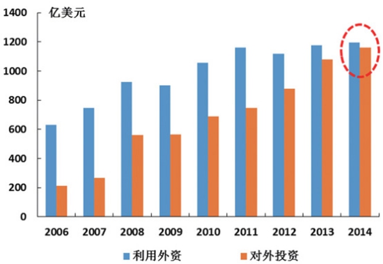 圖8 我國外貿(mào)進出口總額增速變化 3.對外投資快速增長,“引進來”與“走出去”并重。 我國將實現(xiàn)由利用外資為主逐步轉向利用外資與對外投資并重得格局轉換。改革開放初期,由于經(jīng)濟社會發(fā)展水平較低,發(fā)展面臨資金短缺的壓力,形成了我國以引進外資為主的格局。隨著我國經(jīng)濟發(fā)展、進入中高收入國家行列和成為世界外匯儲備最多的國家,在繼續(xù)注重利用外資的同時,也逐步擴大對外投資,對外投資流量已居世界第三,吸引外資和對外投資都達到1000億美元規(guī)模,兩者基本均衡(如圖9所示)。從我國“走出去”的重點行業(yè)來看,主要集中于采礦業(yè)、制造業(yè)、服務業(yè)、高科技行業(yè)和優(yōu)勢農(nóng)業(yè)。預計“十三五”期間對外投資將保持1000億美元,“走出去”發(fā)展將使我國海運需求由原來的放射結構,轉向全球網(wǎng)絡化結構;同時針對“走出去”面臨各種風險,要求海運在應對突發(fā)事件中更好地發(fā)揮支持保障作用。