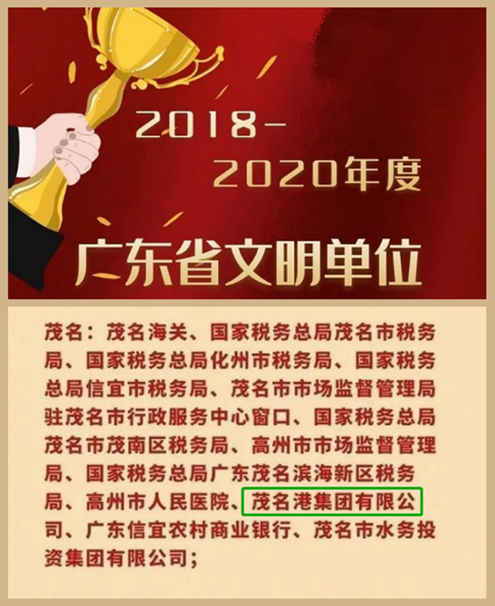 近日,廣東省精神文明建設表彰大會在廣州隆重舉行。作為成立僅八年多時間的市屬國有企業(yè),茂名港集團榮獲廣東省2018-2020年度文明單位稱號。