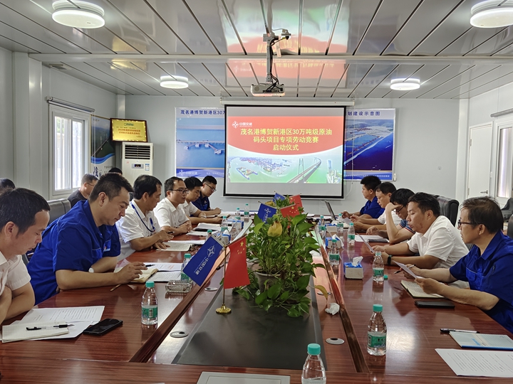 2023年9月19日,茂名港博賀新港區(qū)30萬噸級原油碼頭項目臨時黨支部主辦的“齊心協(xié)力,奮戰(zhàn)百天,沖刺全年指標”專項勞動競賽啟動儀式在30萬噸級原油碼頭項目部辦公區(qū)成功舉辦。集團黨委委員、總工程師蔡光章出席啟動儀式并講話。
