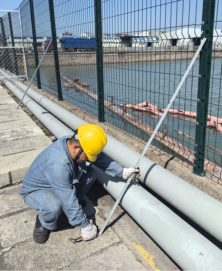 碼頭之間周界圍擋是安全管控的重要屏障,也是港口設(shè)施保安工作重要設(shè)施之一。按外委維修方案,需整體制作圍擋,費(fèi)用約8萬(wàn)元。 “能不能自己干?!”黨員維修組現(xiàn)場(chǎng)測(cè)量圍擋尺寸,設(shè)計(jì)“鋼管立柱+鋼絲網(wǎng)格+防撞條”的簡(jiǎn)易圍擋方案,反復(fù)論證可行性后,決定擼起袖子自己干!為確保穩(wěn)固性,黨員維修組用水平儀一米一米測(cè)標(biāo)高,用扳手一顆一顆緊螺栓;為防臺(tái)風(fēng)天氣傾倒,把鋼管底部焊接在混凝土基座,用水平尺校準(zhǔn)“毫米級(jí)”垂直度。5天的連續(xù)作業(yè),為港口經(jīng)營(yíng)公司周界圍擋起整齊牢固的“安全防線”。