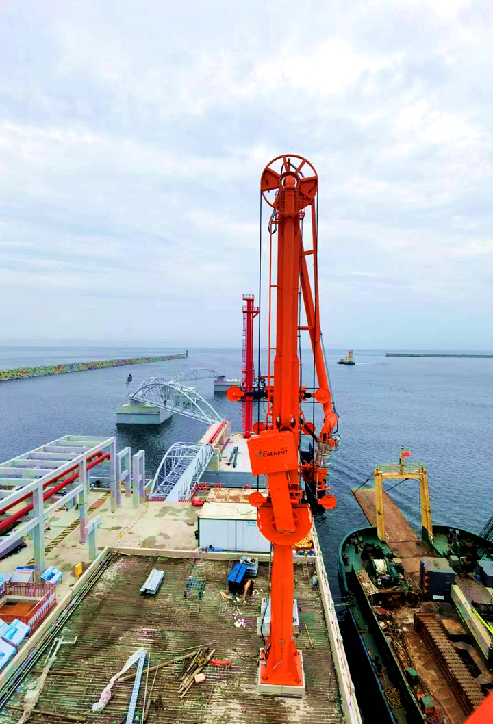 此次安裝的4臺裝卸臂堪稱碼頭“大動脈”,每臺高23.3米、重41.83噸,采用電/液驅動技術,具備高效、安全、穩(wěn)定的輸油能力,全部投用后,每年可助力完成1650萬噸原油輸送任務,將大幅提升茂名港原油接卸與中轉效率。同步安裝的具有浮動功能的登船梯高26.5米、重約32噸,根據(jù)潮汐自動調節(jié)梯高度的智能設計,為10萬到30萬噸級的船舶提供了安全便捷的通道;2座高29米的消防炮塔上的消防水炮最大覆蓋半徑達99米,其射程遠、流量大,如同“安全衛(wèi)士”構筑起碼頭前沿的安全保障網(wǎng)。