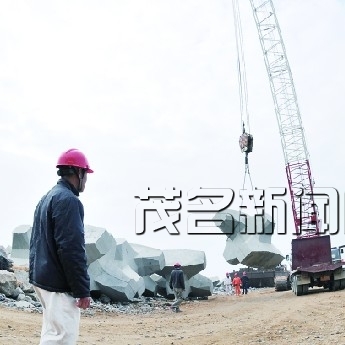 “正在吊裝的鋼筋混凝土構(gòu)件叫‘扭王字塊’,用來擺放在防波堤的最外面一層,通過削弱波浪的沖擊力保護(hù)防波堤!表椖渴┕挝恢袊a(chǎn)廣州建港工程公司的黃經(jīng)理這樣告訴記者。他口中所說的“扭王字塊”重達(dá)16噸,施工人員正在用巨型吊機(jī)將其安放到防波堤側(cè)面,與其他“扭王字塊”形成了一片“巨石森林”,全面保護(hù)著防波堤。