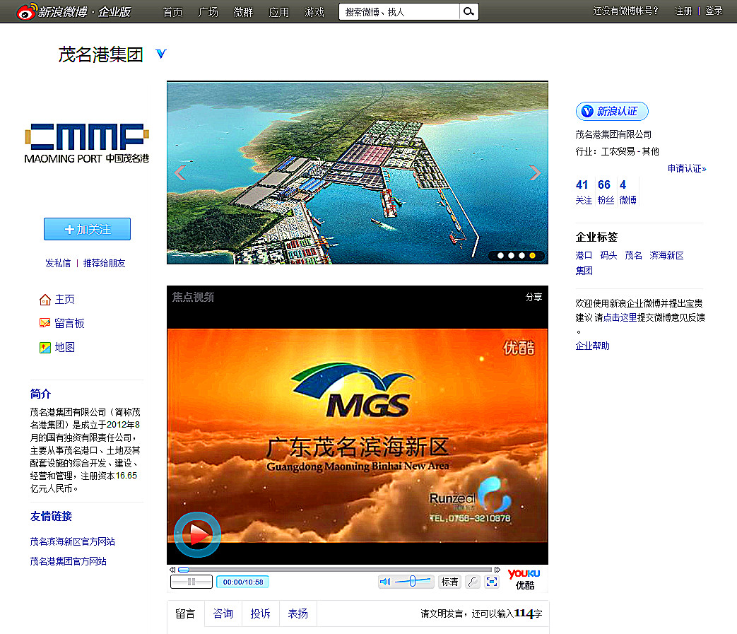 7月5日,茂名港集團有限公司在新浪開通了企業(yè)官方微博“茂名港集團”,并成功取得新浪企業(yè)官方藍色V認證!這是茂名港集團為樹立良好的企業(yè)形象,大膽創(chuàng)新,借勢新浪微博,搭建對外聯(lián)系服務的平臺,這有利于茂名港集團與社會各界進行全方位的互動與交流。 茂名港集團今后將會在微博發(fā)布最新、最及時的公司動態(tài)。關注我們的微博,您可以了解到我公司的最新資訊。歡迎您給我們提出寶貴的建議與意見! 茂名港集團新浪官方微博網(wǎng)址:http://weibo.com/u/3578418997 茂名港集團新浪官方微博期待您的關注。 關注你我!關注@茂名港集團!