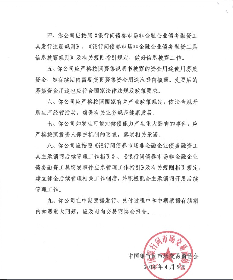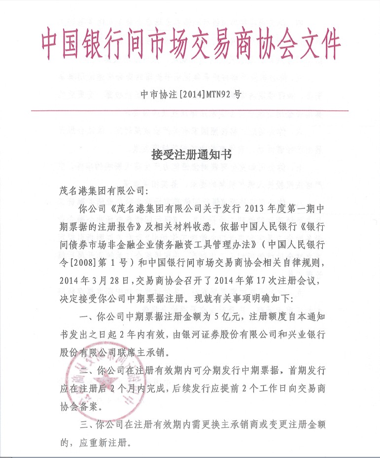 4月14日,茂名港集團(tuán)收到中國銀行間市場交易商協(xié)會(huì)下發(fā)的《接受注冊(cè)通知書》,交易商協(xié)會(huì)正式?jīng)Q定接受茂名港集團(tuán)注冊(cè)發(fā)行5億元中期票據(jù)。這不僅為茂名港口項(xiàng)目的建設(shè)提供了堅(jiān)實(shí)的資金保障,而且開創(chuàng)了茂名地區(qū)企業(yè)融資創(chuàng)新的先河,將對(duì)茂名市企業(yè)開拓直接融資市場具有重大影響。